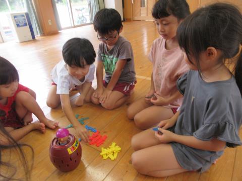 子育て支援センターで、交流保育を行いました。水鉄砲にシャボン玉、泡遊び・・・暑い中でしたが子どもたちは元気いっぱいでした!