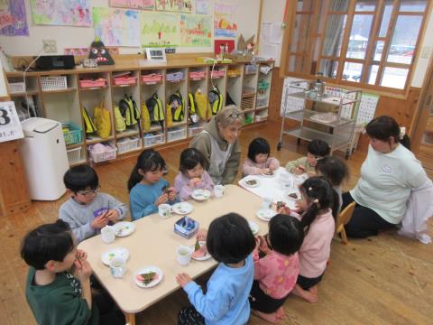 12月5日に神楽教室でお世話になった齋藤さんに生活発表会でやった劇遊びや歌やベルを見ていただきました。そのあとは鬼棒作り、給食も一緒に食べました!楽しいひと時を過ごすことが出来ました。半年間、大変お世話になりました!